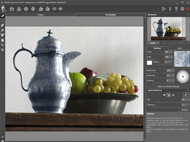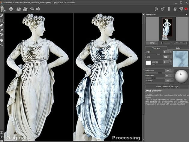 Do you want to make with a click a car in snakeskin or a statue dressed in fine clothes? With AKVIS Decorator you can create things that were unimaginable even to Mother Nature. It lets you change the surface of an object in a realistic manner. There is a great variety of patterns in the built-in Texture Library, more than 1800 textures, to apply; from fabrics to stones and metal, from food to nature elements. You can even apply your own texture. The software follows the underlying features of the object, the texture that already exists. The new pattern looks absolutely natural and makes you see things differently. Experiment with Decorator to discover its full potential!