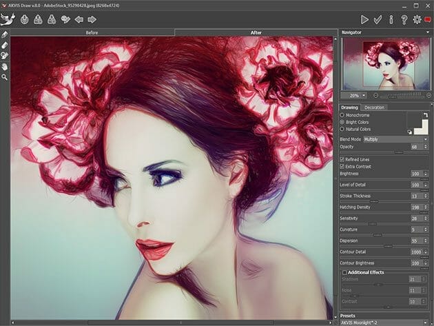 AKVIS Draw lets you create hand-drawn pencil sketches and line art pictures from your digital photos! The software is incredibly easy to use; it makes a realistic looking drawing effect in just one click! Equipped with the ready-to-use presets and adjustable parameters, the program renders various esquisse drawing styles. Besides creating black and white sketches, the software also lets you make color drawings. Load your image into the program and adjust settings to generate an artwork. The software creatively produces pencil strokes, imitating an artist’s view.