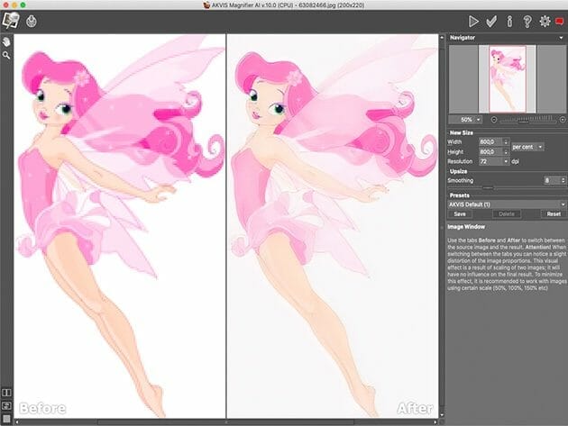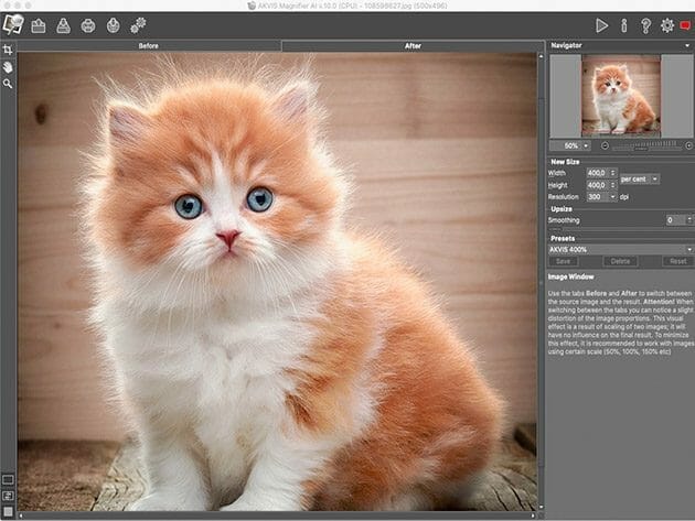 AKVIS Magnifier AI is an efficient tool for increasing image resolution. If you attempt to blow up a picture using the standard Resize command of a photo editor, you will notice that the resulting photo is blurred and pixelated. Magnifier AI copes with this problem and delivers high-quality results. Featuring advanced resizing neural networks based algorithms, Magnifier AI enlarges digital pictures to super-high resolution up to 800% for producing stunning wall-sized prints! The program allows enlarging an image to a super-high resolution, making large format gigapixel posters and panoramas.