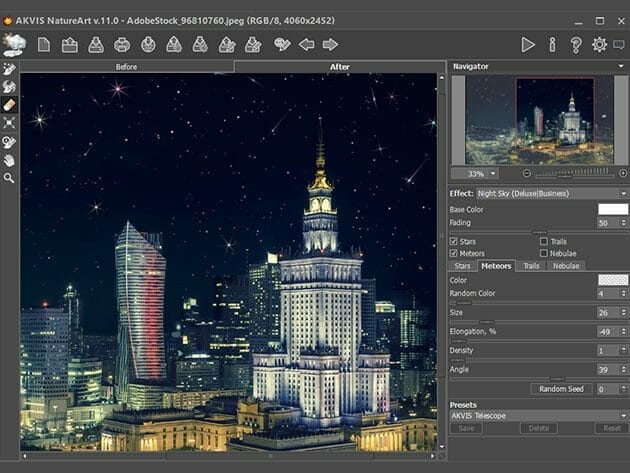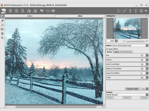 Silicon Summit:“Need a rainy sky with magnificent lightning bolts – no problem. Need a burning field or fire for your camp fire pit – again no problem. Akvis NatureArt can add these plus many other nature effects to your photos.”