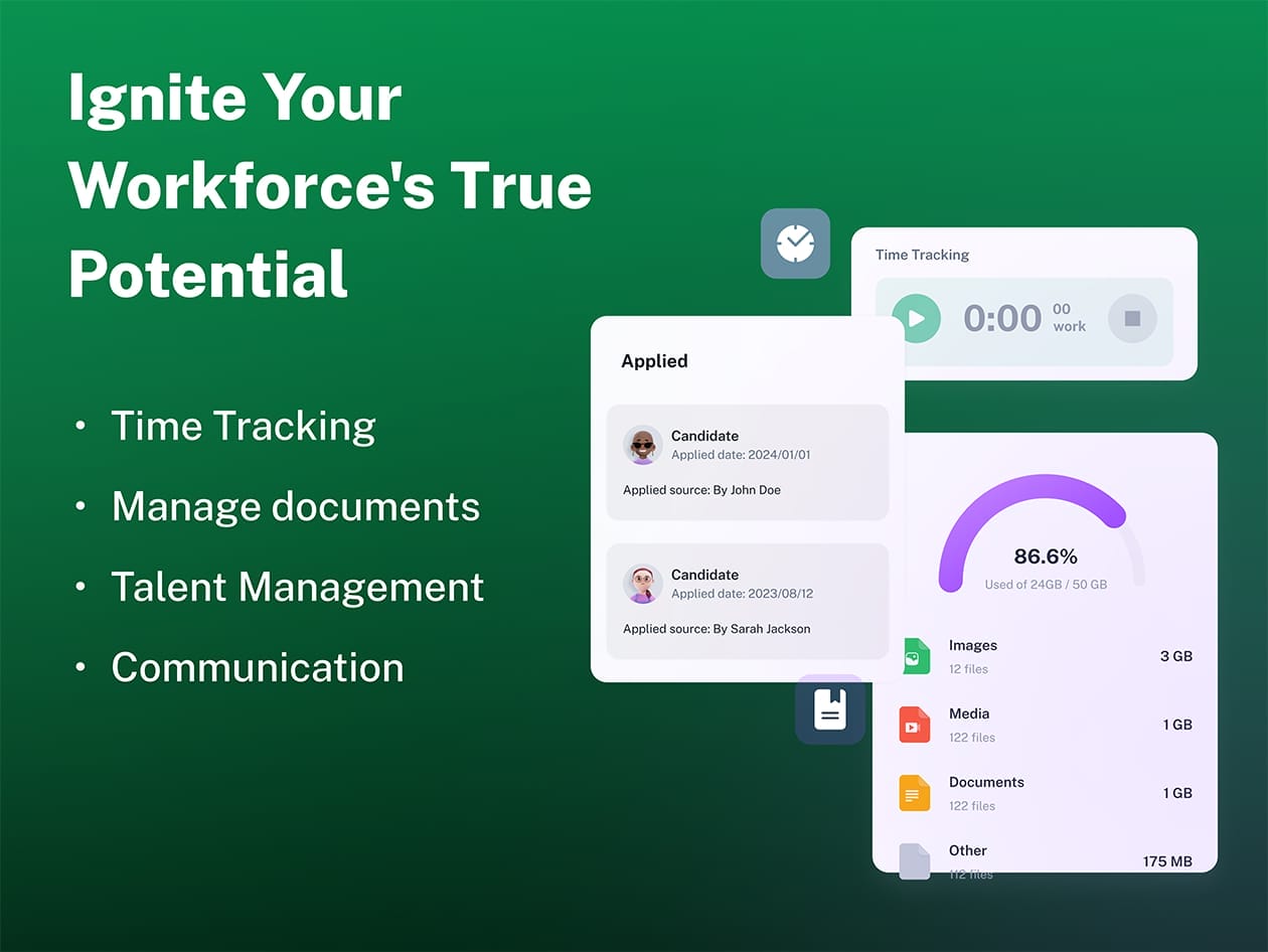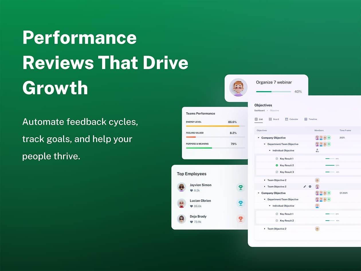 Hiring & Performance: Streamline recruitment with ATS tools, run review cycles, and set meaningful OKRs.