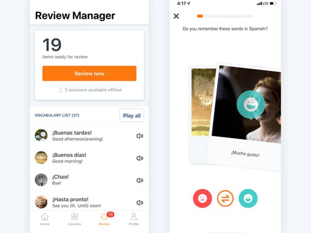 Use offline mode to access courses, lessons & review items when not on Wi-Fi—just download them beforehand