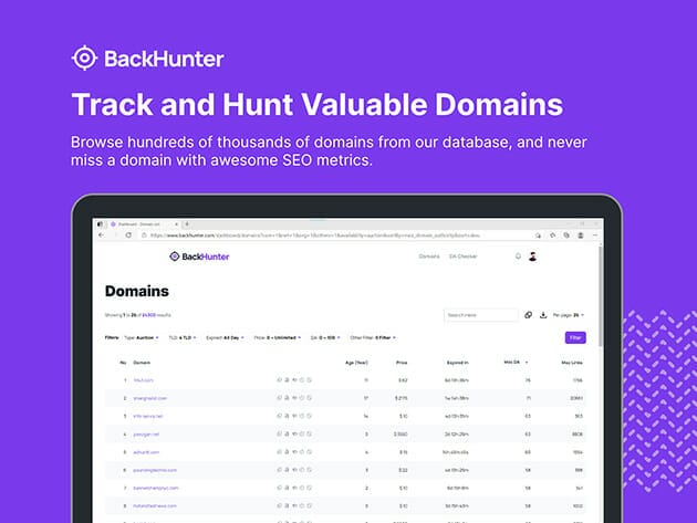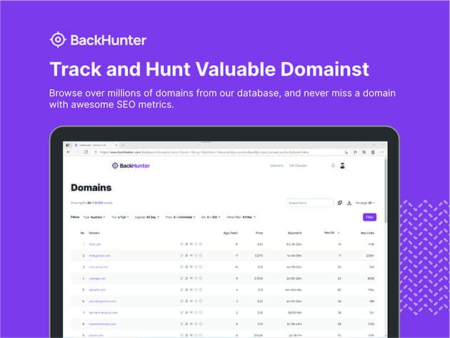Track and Hunt Valuable Domains with Backhunter. Backhunter is a web-based application to help you find good quality expired domains for Search Engine Optimization (SEO). It provides Filtering tools and SEO metrics to assist and simplify expired and aged domain hunting, making it more quick and efficient. You will only need a few clicks to find domains with awesome SEO metrics.