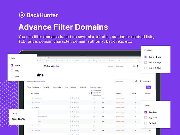 Filter domains. Filter domains based on several attributes, auction or expired lists, TLD, price, domain character, domain authority, backlinks, etc.