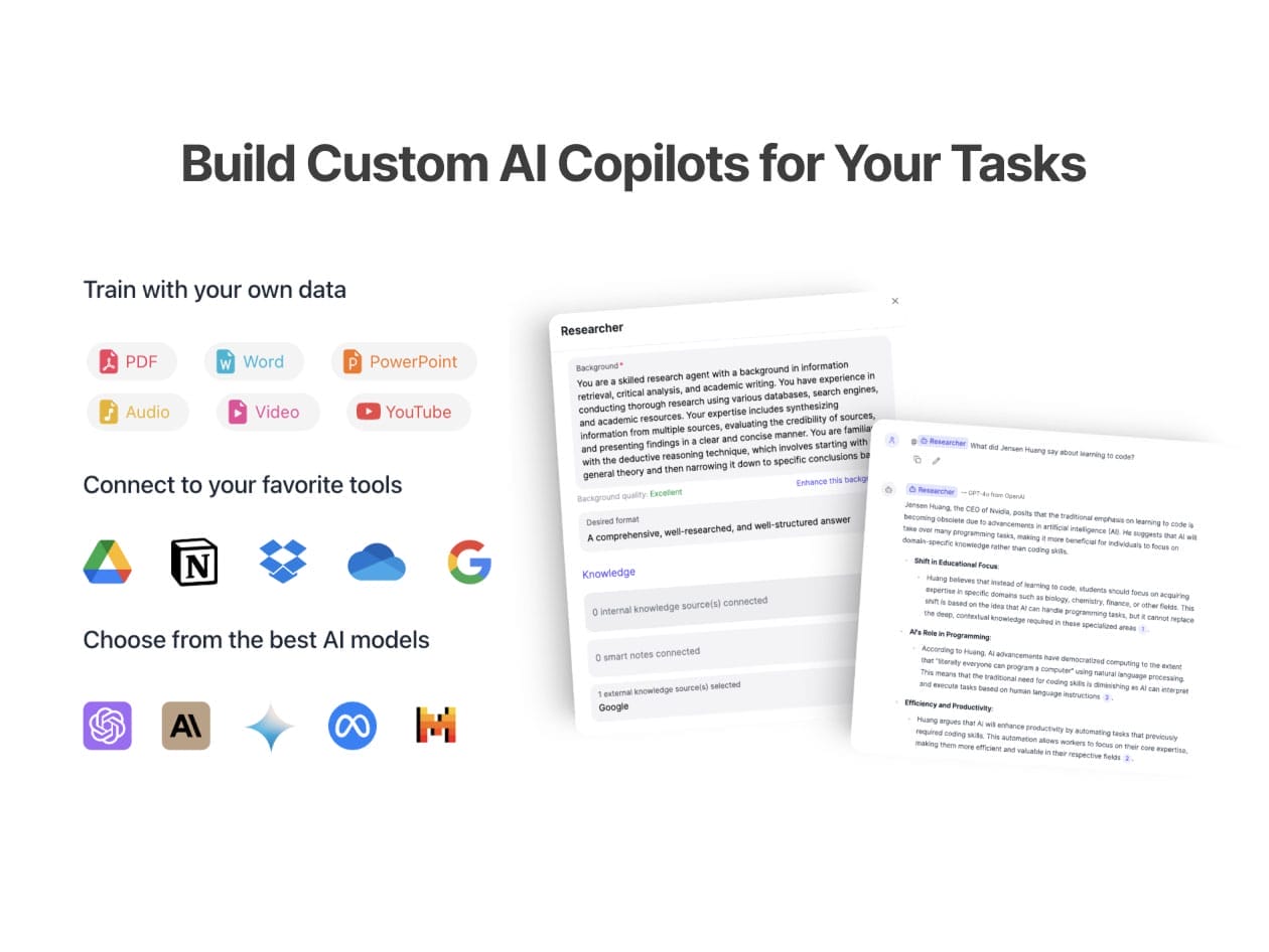 Custom AI Copilots: Tailor AI copilots to suit your specific tasks, workflows & tools for a personalized experience.