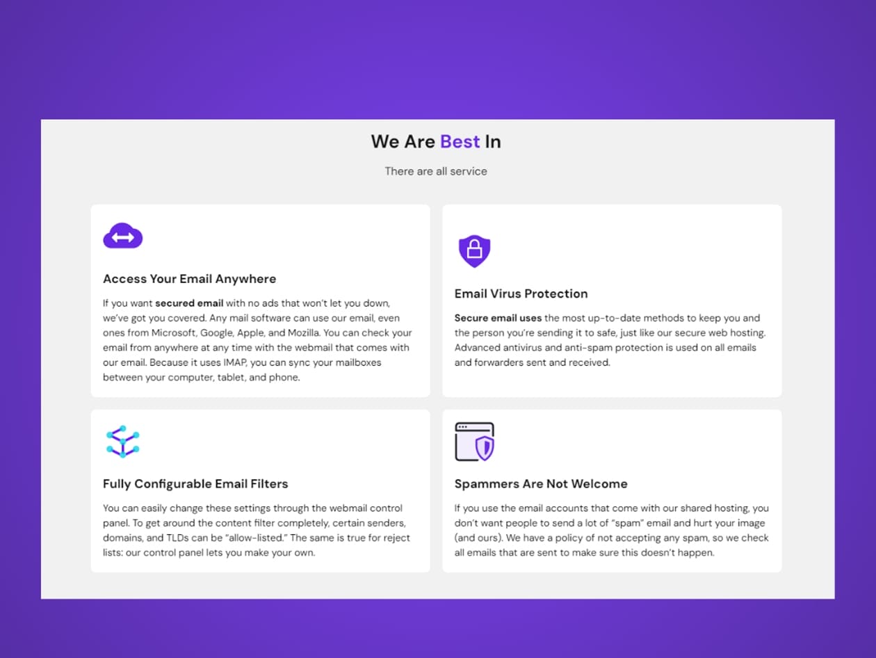 Email Access Anywhere: Check your email on any device via webmail with IMAP syncing across desktop, tablet, and phone.
