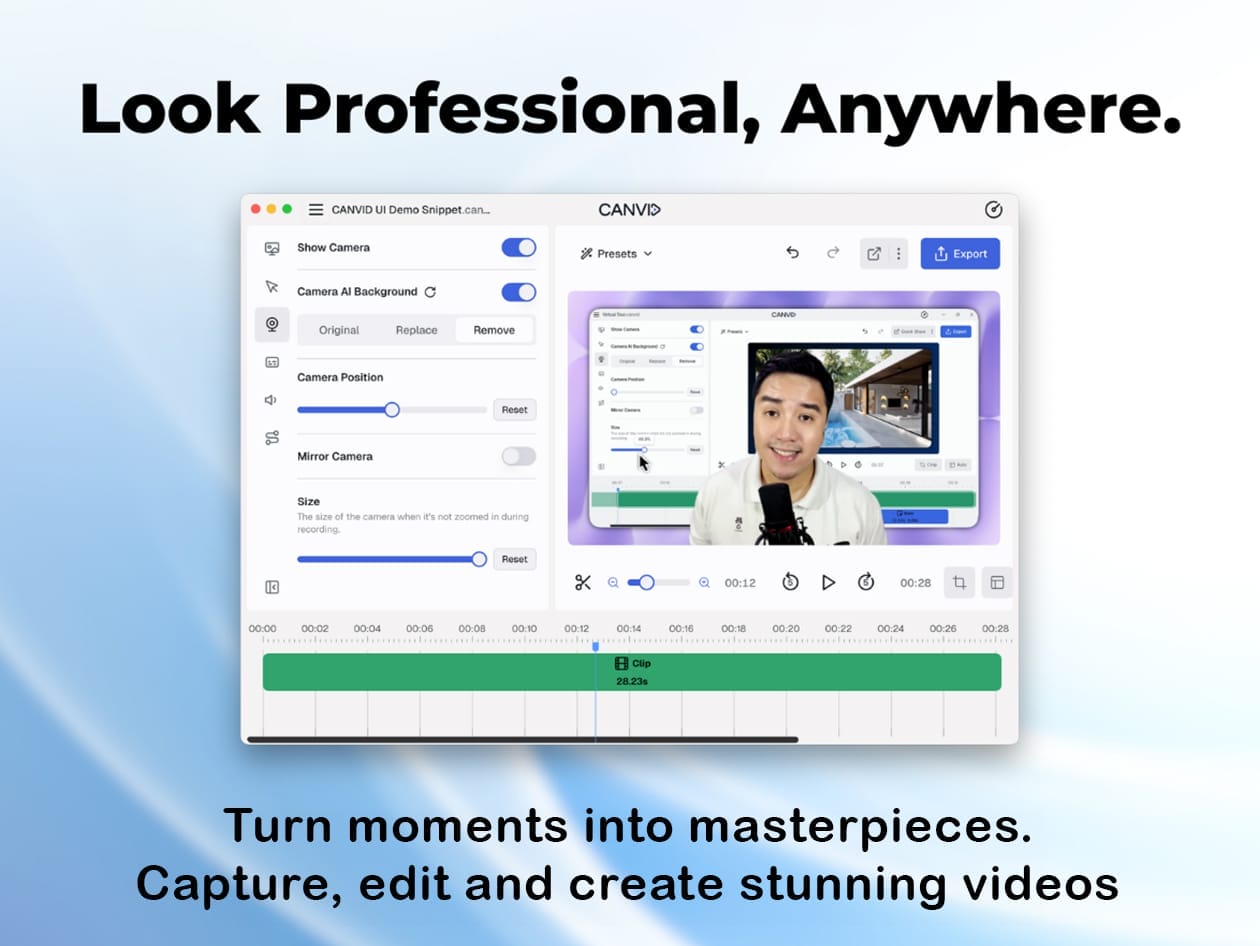 • AI-Enhanced Voice: Speak with confidence knowing Canvid’s AI voice enhancement will ensure everything sounds crystal clear.