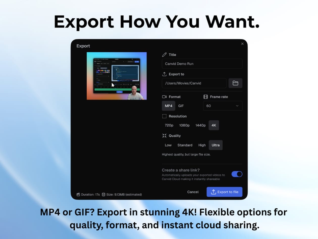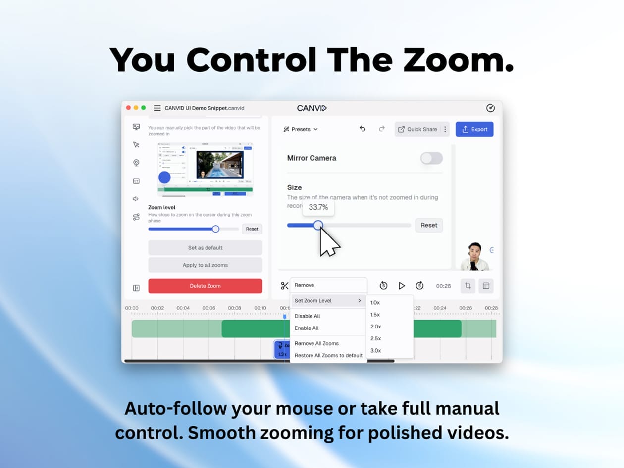 Canvid isn’t just a screen recorder—it’s your all-in-one video creation studio, powered by AI. Whether you’re showcasing an app or creating tutorials, Canvid makes recording on Windows and Mac smooth and professional. With smooth motion, smart zooms, crystal-clear audio, and cinematic effects, your recordings won’t just inform, they’ll impress! No need for complex tools or editing know-how. Just hit record, and let Canvid do the hard work while you focus on your message.