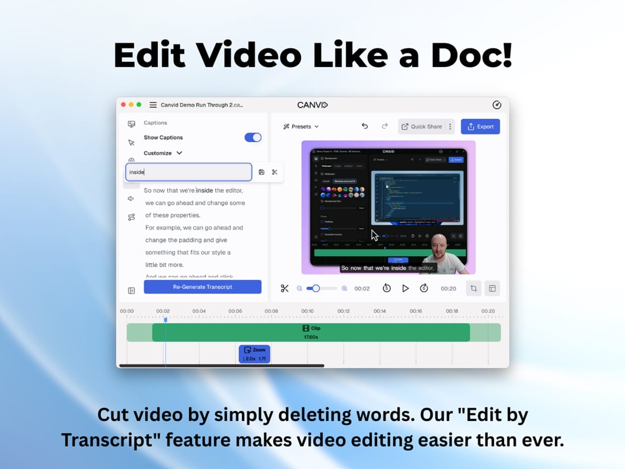 • Auto-Captions: Automatically generate captions for a more accessible and professional video. Edit them on the fly to ensure top-notch accuracy.