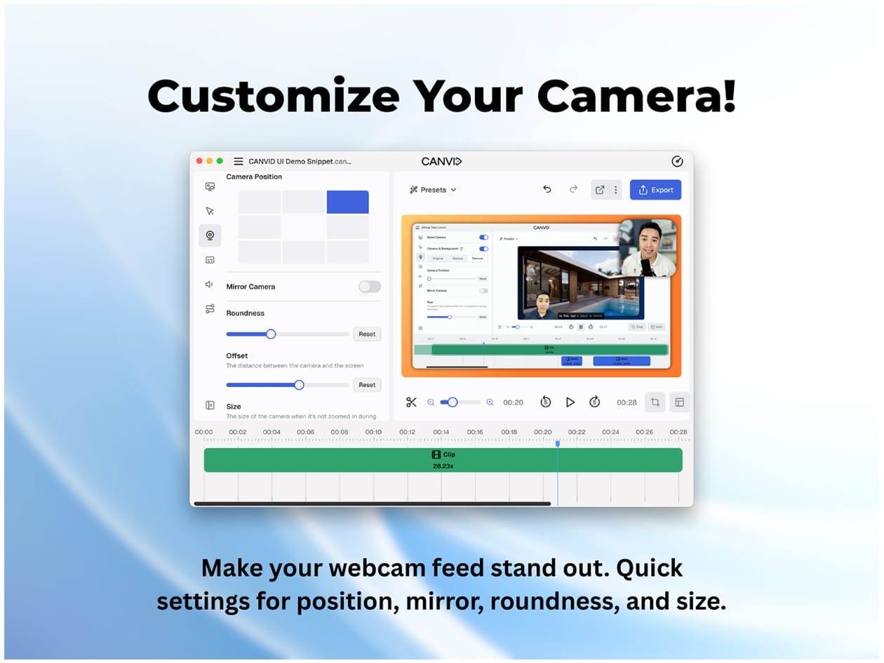 • Precision: Fine-tune your camera’s position and size for seamless integration with your content, ensuring every detail is perfect.