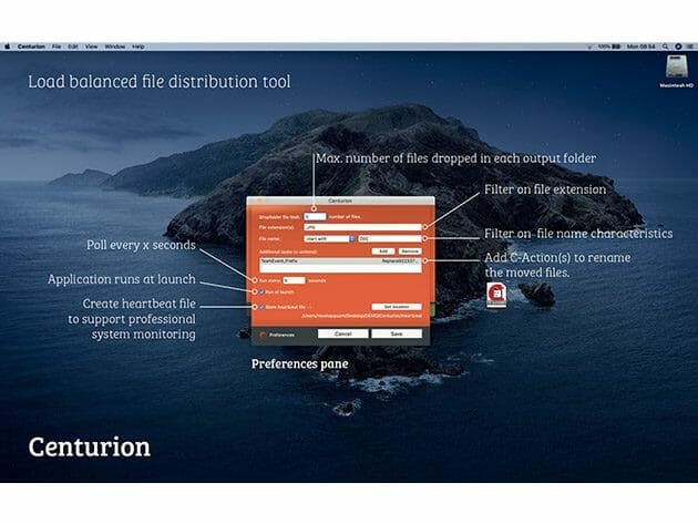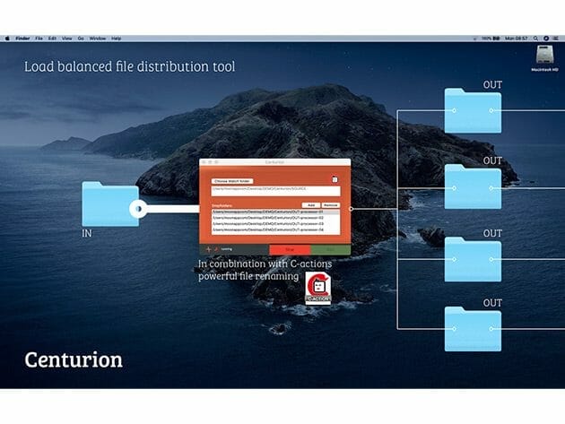 Say goodbye to cluttered folders and random files with Centurion. This productivity utility app helps you manage a massive load of files. The application will watch a source folder and will distribute the files load balanced to multiple destination folders, based on the file extension and/or file name characteristics. In one run, files can be renamed using c-actions®. Centurion becomes extremely handy if you have many files to handle in a short time, and if you need to distribute the files between multiple processors, computers, systems, users, and more.