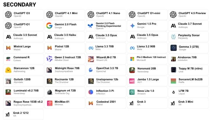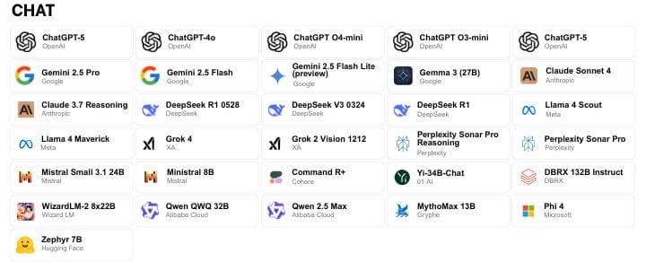 40+ AI Models: Includes GPT-4o, Claude Sonnet 4, Gemini 1.5 Flash, DeepSeek V3, Llama, Perplexity, and many more