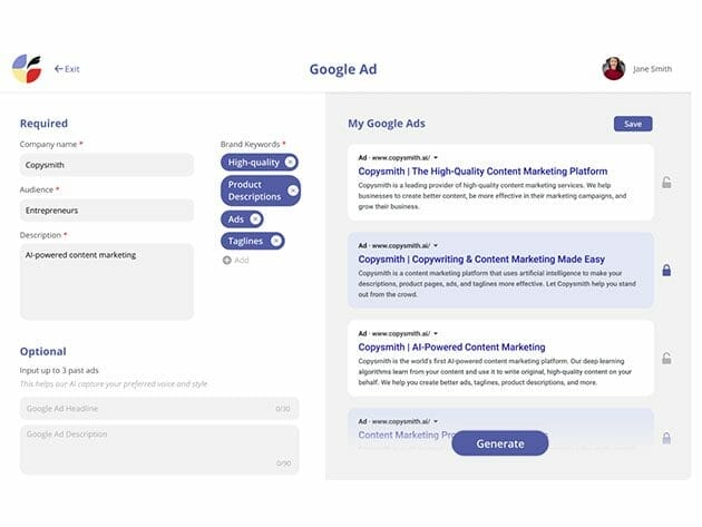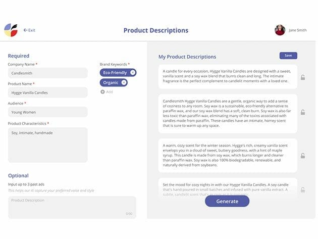 Automatically generate high-performing Google ads, Facebook ads, product descriptions, taglines, SEO metatags, & more