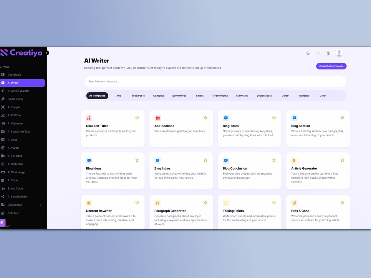 AI Templates: Choose from 70+ ready-made templates or build and save your own for blogs, ads, product descriptions, and more.