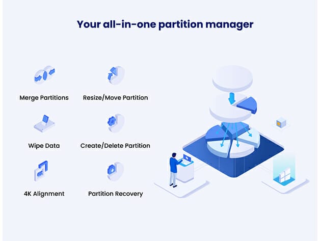 Cover all of the partitioning features and unlock the full potential of your hard drives, both HDD and SSD. Partition wizards include: create, resize, move, extend, merge, split, format, align, hide, wipe, delete, check, change and clean up disk or partition. Even support to manage encrypted BitLocker partitions.