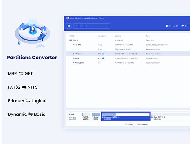 To run the system better and boost hard drive capability, it makes sense to convert your disk or partition between different types, layouts, and file systems. Change between MBR and GPT, FAT32 and NTFS, primary and logical, or dynamic and basic.