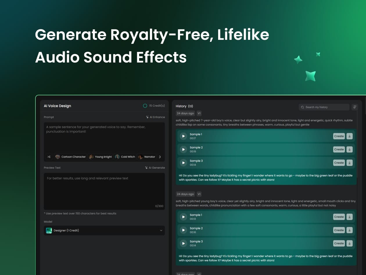 Custom AI Voices: Generate unique voiceovers for your content, characters, or brand.