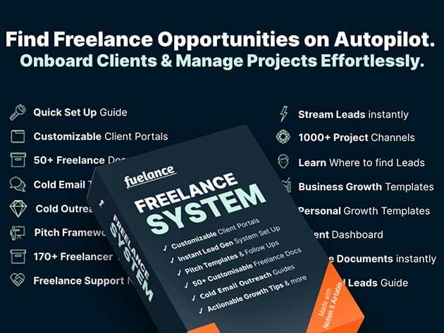 Fuelance is the veritable Swiss Army Knife to build profitable freelance businesses. This comprehensive Notion Based Dashboard & System is the full cycle freelancing solution that gets you set up with automated lead generation systems, customizable client platforms, 50+ documents/templates, cold outreach guides, and more.