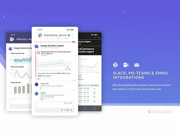 Your business is complicated, your data shouldn’t be. GA Insights is a way to keep up to date with your website and ad metrics. You can receive custom reports of your metrics, goals, and statistics straight into the tools your team already uses. Have peace of mind knowing that your team will find out quickly if anything goes awry with your website.