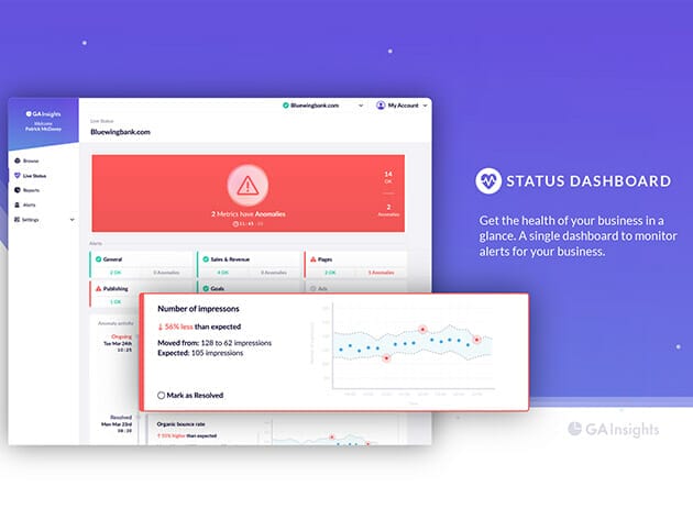 Business health dashboard. Monitor the metrics you care about including your bounce rate, goals, sales, ad spend, page load time & more