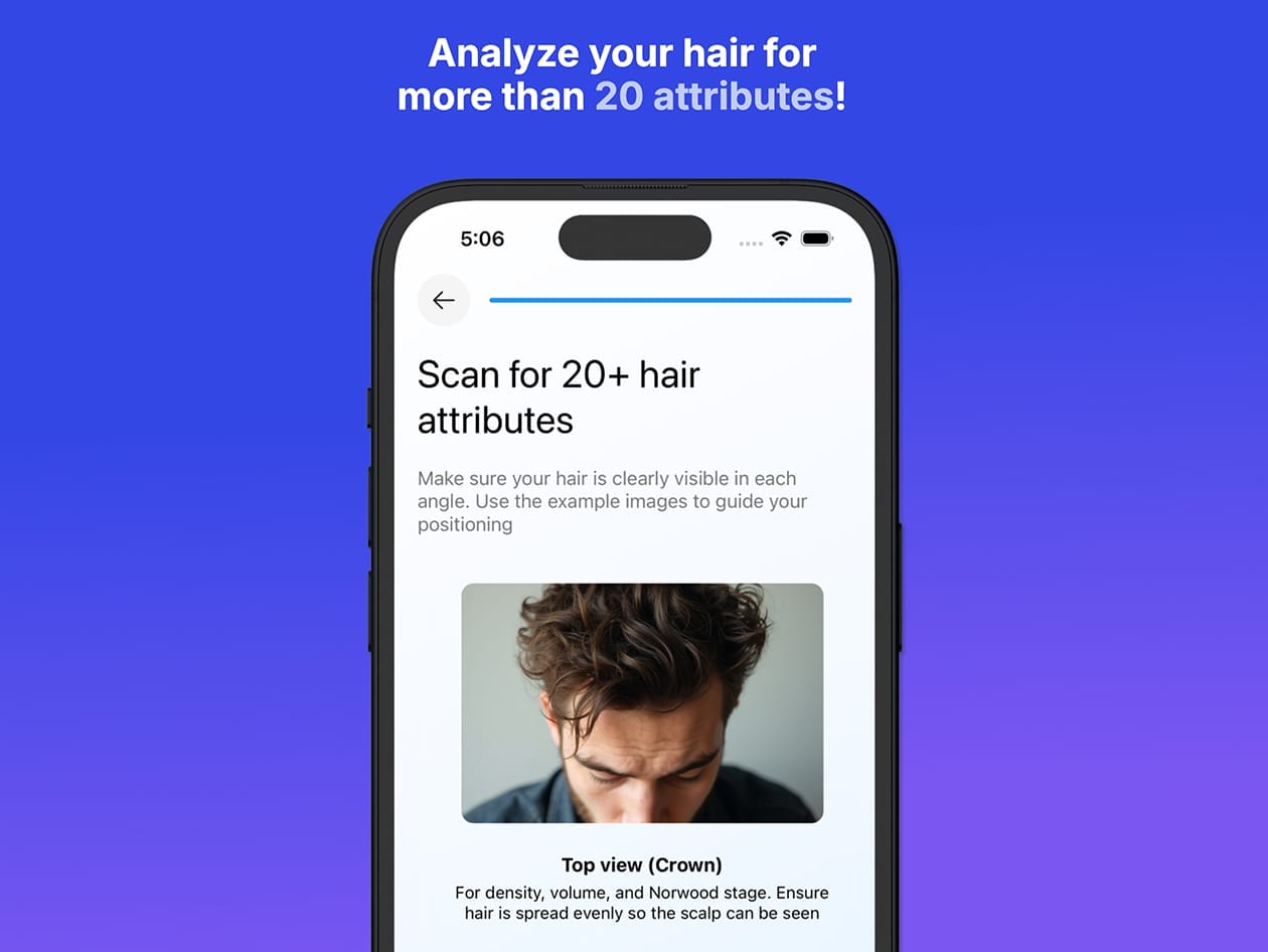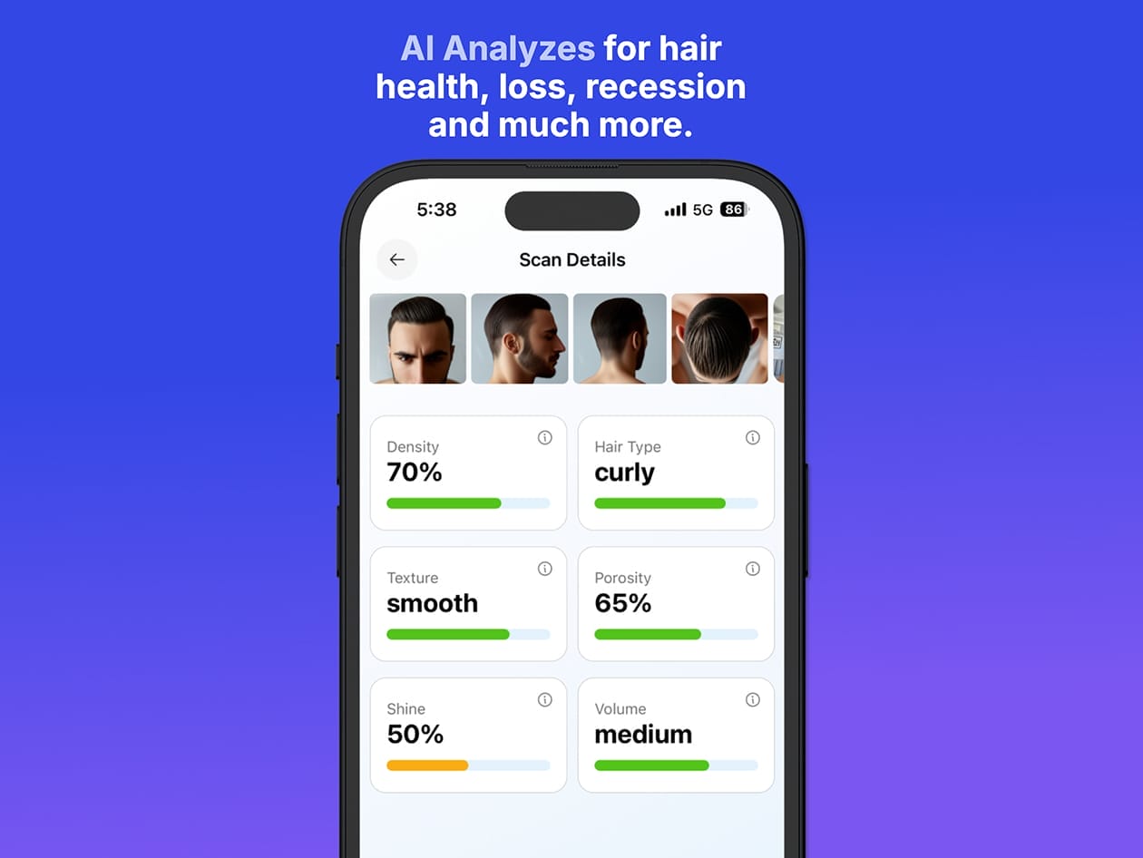 AI Hair Analysis: Instantly analyze your hair’s density, texture, porosity, volume, and shine.