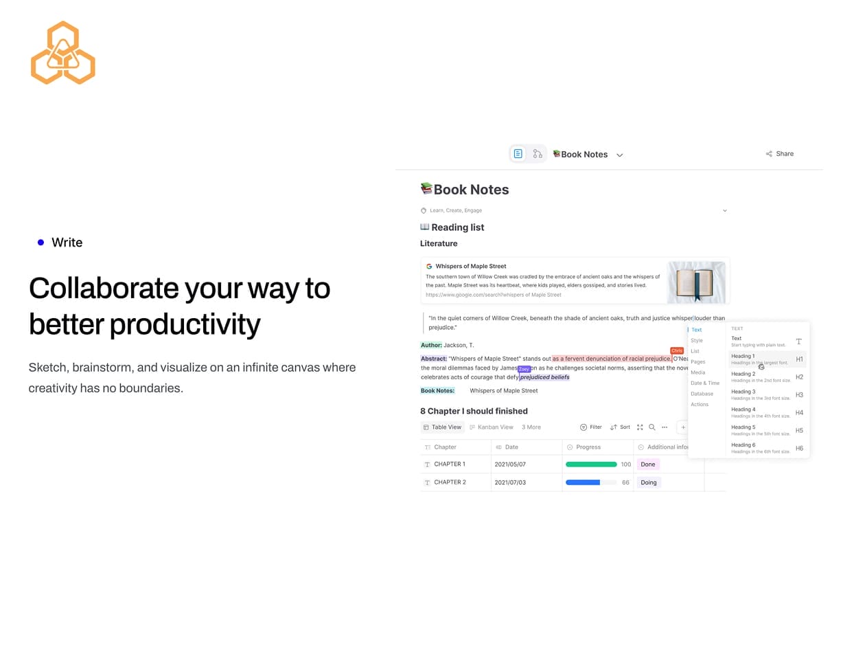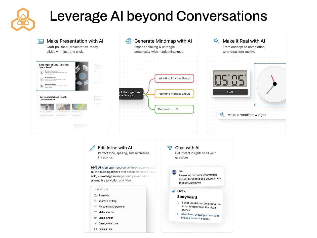 With intelligent AI features working alongside you, Hive helps you summarize, rewrite, and turn thoughts into clear action plans instantly, uncover insights faster, and refine ideas with clarity. Whether you’re mapping big concepts, planning complex projects, or simply trying to make sense of your thoughts, Hive transforms creative chaos into focused progress.