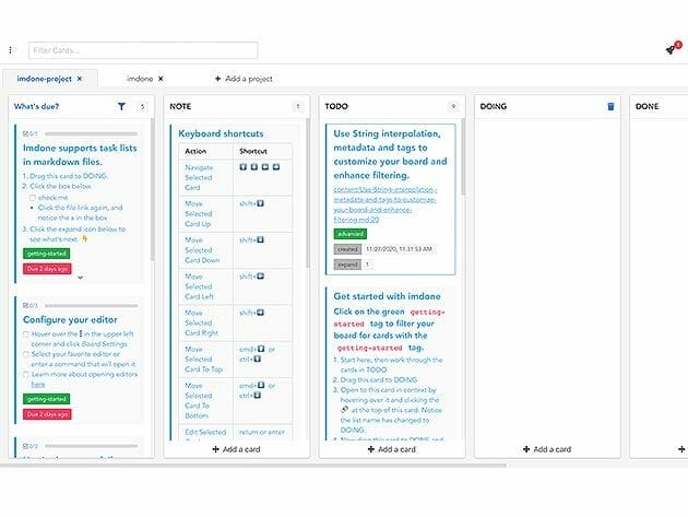 Imdone is a simple and powerful kanban board for people who work with markdown and code. Blocks of markdown in your notes, docs, and code are represented as cards on your kanban boards. You can add and edit cards using the built-in card editor or your favorite text/markdown editor, making it very convenient to update your tasks while you’re working on a markdown document or code. This app also enables you to organize your comments, get work, and add cards lightning fast!
