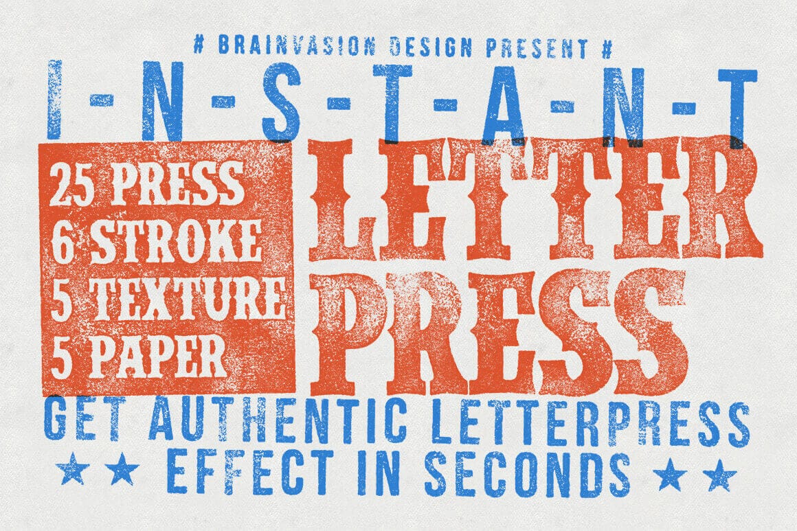 Instant Letterpress is designed to give an authentic letterpress effect to your design in seconds. It’s made with organized layers and unique settings to make a perfect effect and still easy to use. Buy now and make your own letterpress design. The pack comes with 5 paper textures and 5 grunge textures.