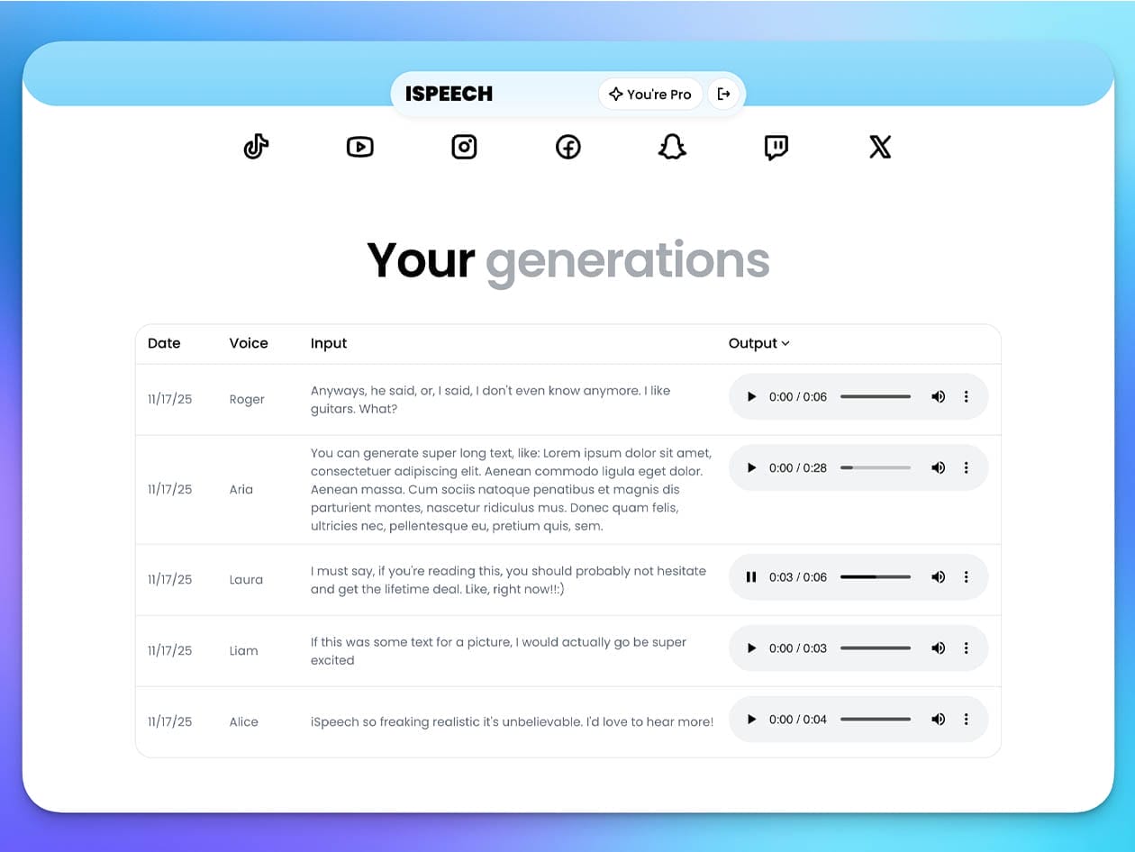*Fair Use Policy: To ensure fair and generous access for all users, iSpeech applies a monthly character generation limit per plan. Pro Plan – 250,000 characters per month.