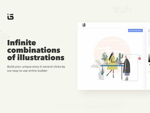 ITG is an illustration builder where everyone can create tons of illustrations for any purpose. ITG builder allows you to quickly build and customize over 1,000 predefined illustrations according to your needs. There you can find a list of compositions. On each illustration, you can change or delete elements, change color and download the whole composition or specific element in JPEG, PNG or SVG format. With ITG.digital, you can start creating cool illustrations with no design knowledge required. Use it for your website, app, presentations, marketing materials, blog posts, or just for fun!
