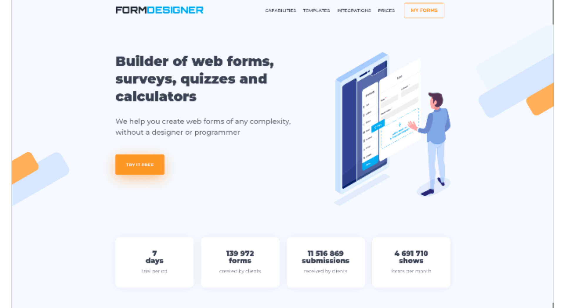 FormDesigner.pro is a powerful online web form builder that allows you to create surveys, quizzes, tests, calculators, online appointment and booking forms, and any other type of web form.
