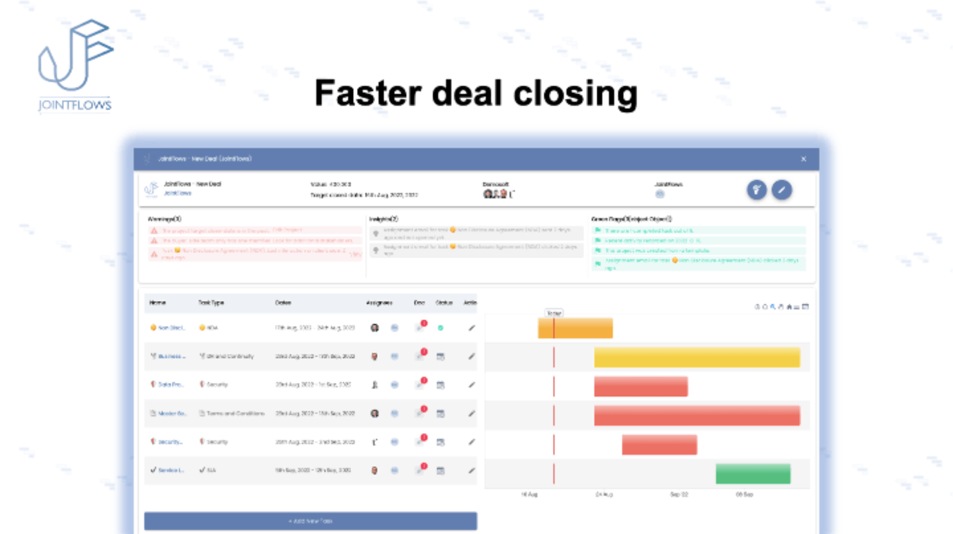 70% of sales rep’s activities are spent getting their deals through legal. Jointflows automates this process to accelerate the sales cycle and generate more revenue faster.