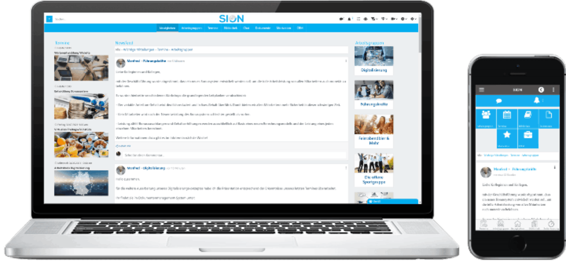 SION is an all-in-one social collaboration tool for communication, information and sales in companies. All employees are involved via browser, iOs and Android app.