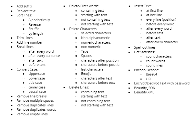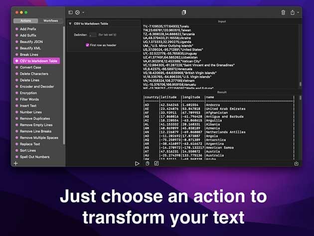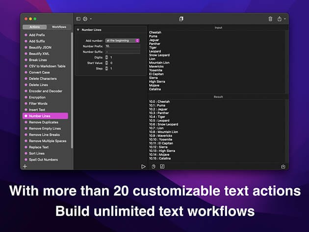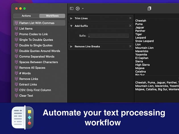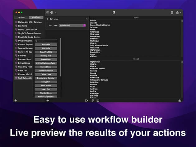 A powerful and easy-to-use tool that will help you transform your text. Text Workflow removes the need to perform repetitive tasks manually on your text. Combine transformation actions to create powerful automations for your text. Save your transformation workflows to use them any time want.