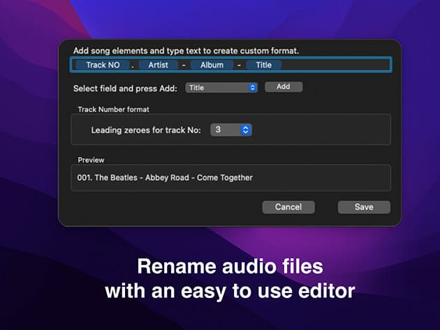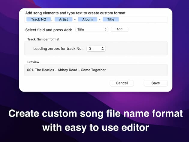 Choose audio file names. Select from predefined name formats or create your custom format using the name format editor