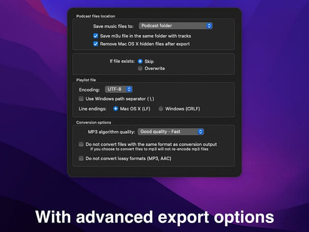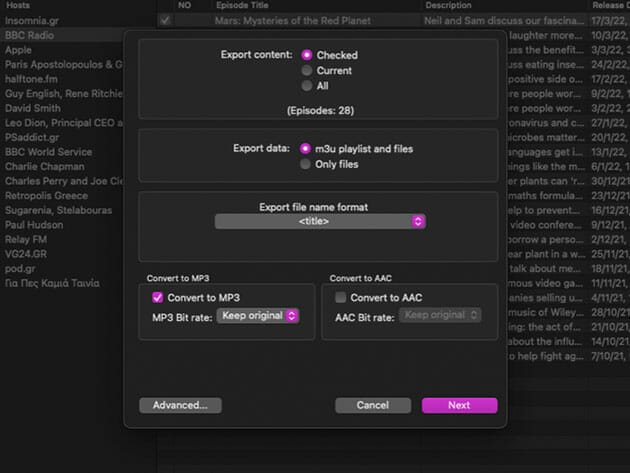 Choose if you want to export your podcasts to mp3, aac, or keep the original files
