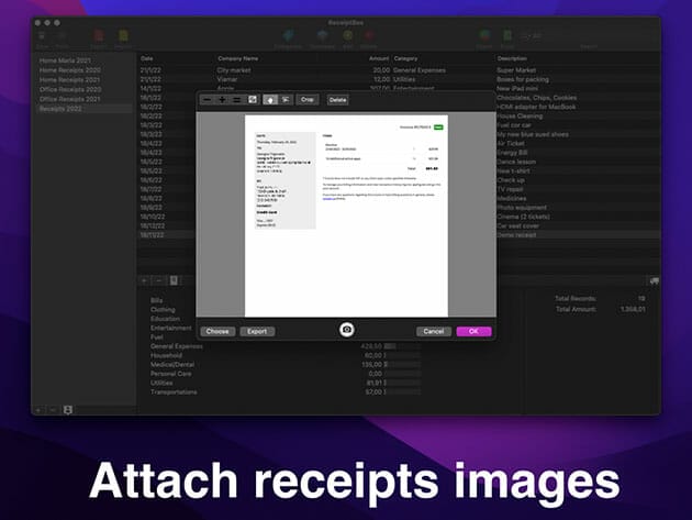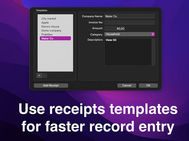 Save and organize your receipts into multiple accounts with just a few mouse clicks. Additionally, you can group your expenses into different user-definable categories and view how much money you spend in any given category. Use personalized templates using exiting receipts in order to reduce data entry to a minimum and improve your productivity.