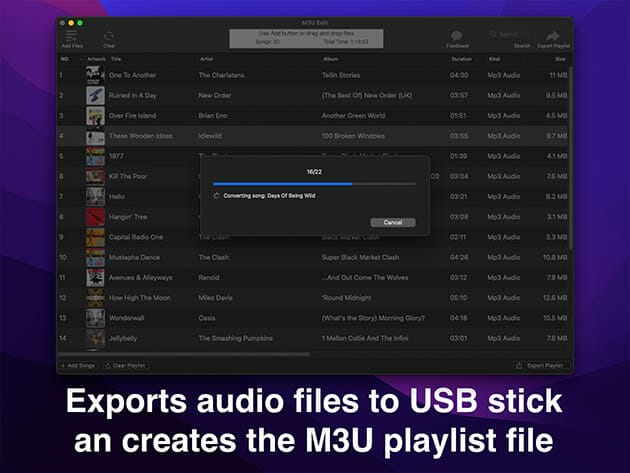 Easy to use. Just select the playlists or albums you want to export and press export button. App will convert, export, organize files & will create the m3u playlist file for you