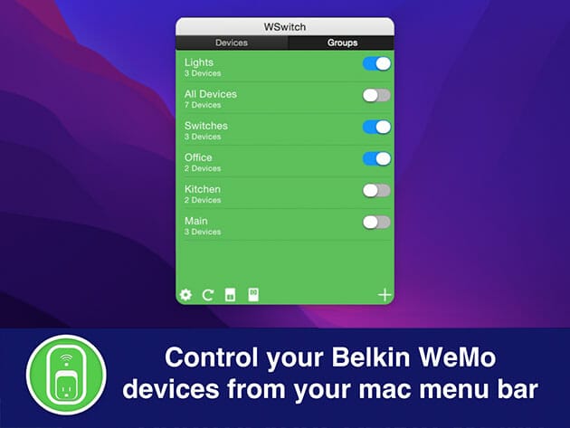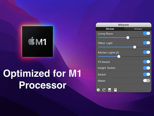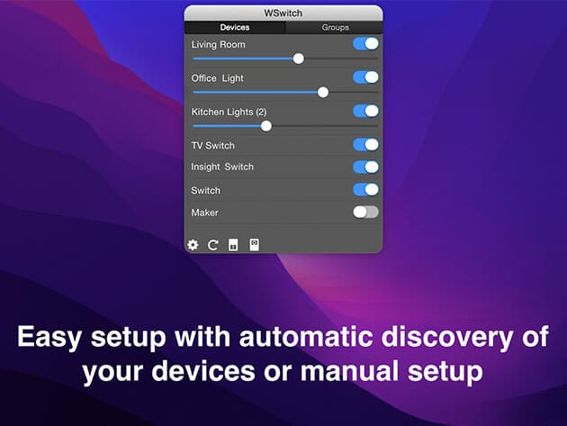 WSwitch is a Mac menu app to control your Smart Switches. WSwitch comes with an easy-to-use interface to control all your devices in one place. You can turn On or Off any device and dim your LED Bulbs. You can also turn On or Off all devices by pressing a button.