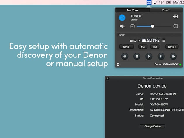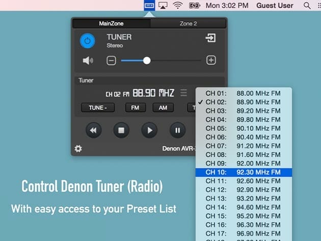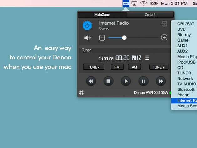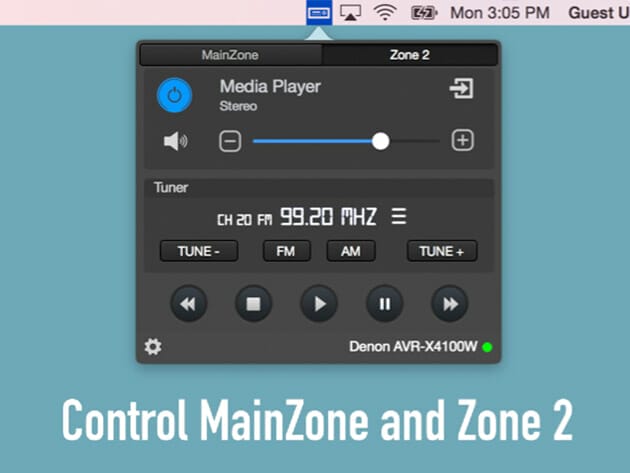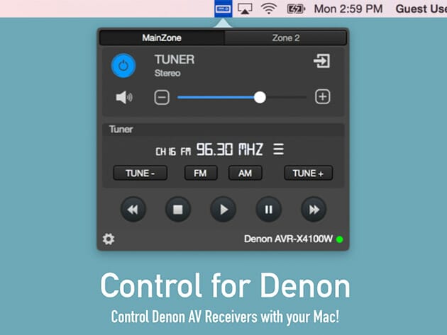 Ever wish you could easily control your Denon AV receivers from your Mac? Even if you’re across the room, or halfway around the world, with this app you can turn on your receiver, adjust the volume, and even change what’s playing just by clicking a button on your Mac. So go ahead—get up and stretch your legs, go eat a snack in the kitchen, or take a nap in the bedroom while you let AVR Control do all the work for you.