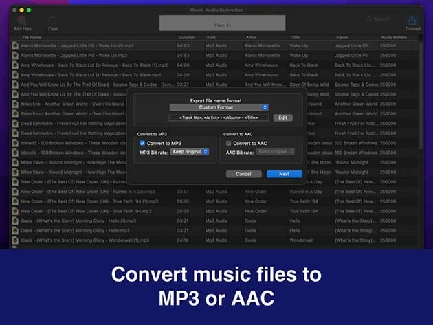 Choose file name format. You can choose if you want to keep original file name or use file metadata to rename files. This way all output files can have a file name like: {artist} – {album} – {title}.mp3. You can also create a custom file name format