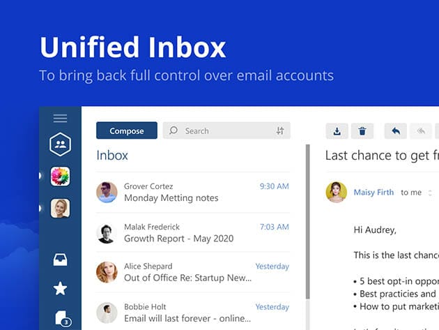 Mailbird provides a clean, simple, and lightning-fast email experience for Windows 7, 8.1, 10, and 11. Whether you are a freelancer managing multiple work accounts or a small business owner juggling campaign emails, social media, and customer/client inquiries – Mailbird helps you stay on top of your inbox without missing any important message.