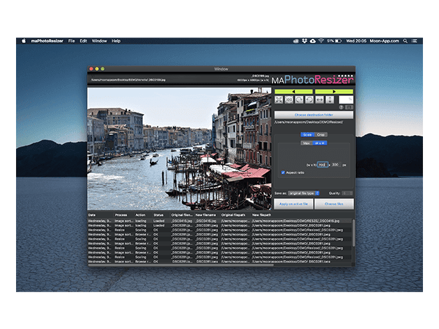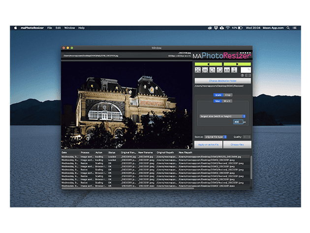 Make your photo editing workflow easier with Moon-App’s maPhotoResizer. This app lets you resize, crop, and convert file type of pictures in batch mode or instantly while browsing thru a collection of photos. It also provides extra functions to easily browse your photos via slides and store your settings in presets. Everything’s easier!