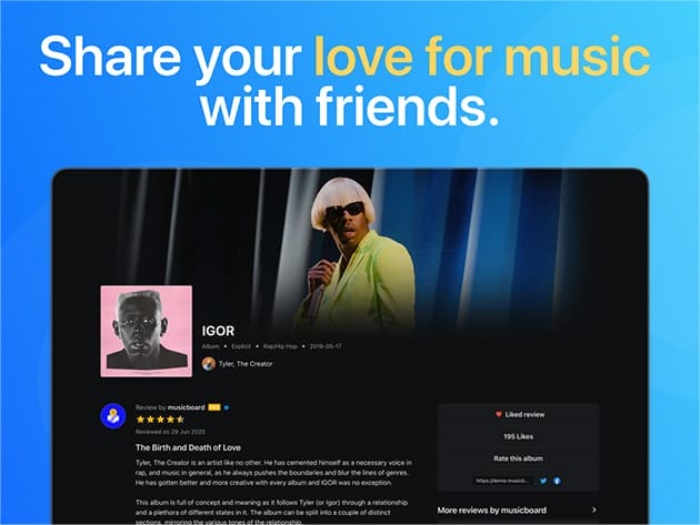 Musicboard is the world’s largest music review site, where users can write reviews, rate music, and compile lists, making it the go-to platform for music enthusiasts. Share your opinions with friends, explore reviews from real people, and discover new music. Create a customized profile with banners and avatars, and express your musical tastes by compiling lists of favorite albums or ranking artist discographies. Stay up to date with new releases and keep track of albums you want to explore. With Musicboard PRO, unlock advanced statistics and further personalize your profile. Join a vibrant community of music lovers today!