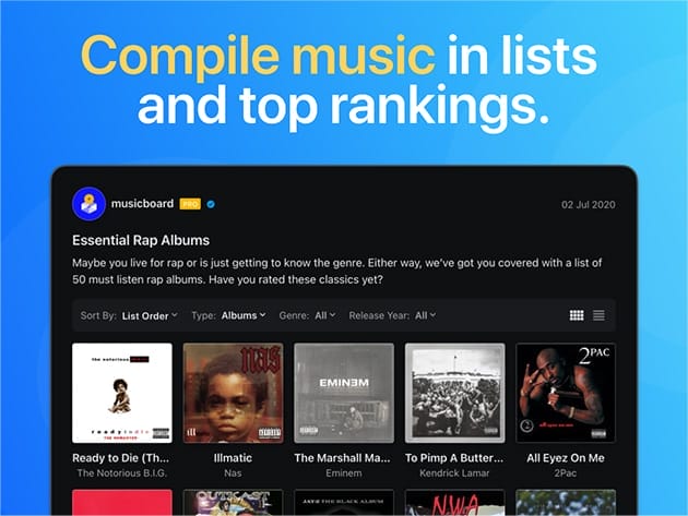 Collect music into lists and show off your favorite albums, rank an artist’s discography, and more