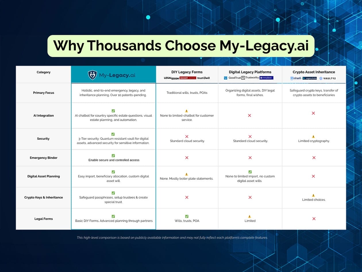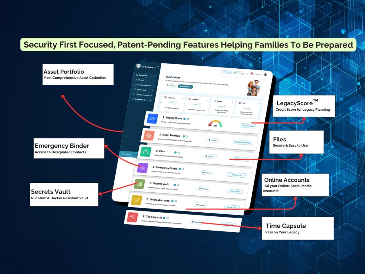 Meet My-Legacy.ai: A simple and ultra-secure way to organize, protect, and pass on essential information. Without My-Legacy, you are burdening your family to scramble to access critical information during most difficult times.