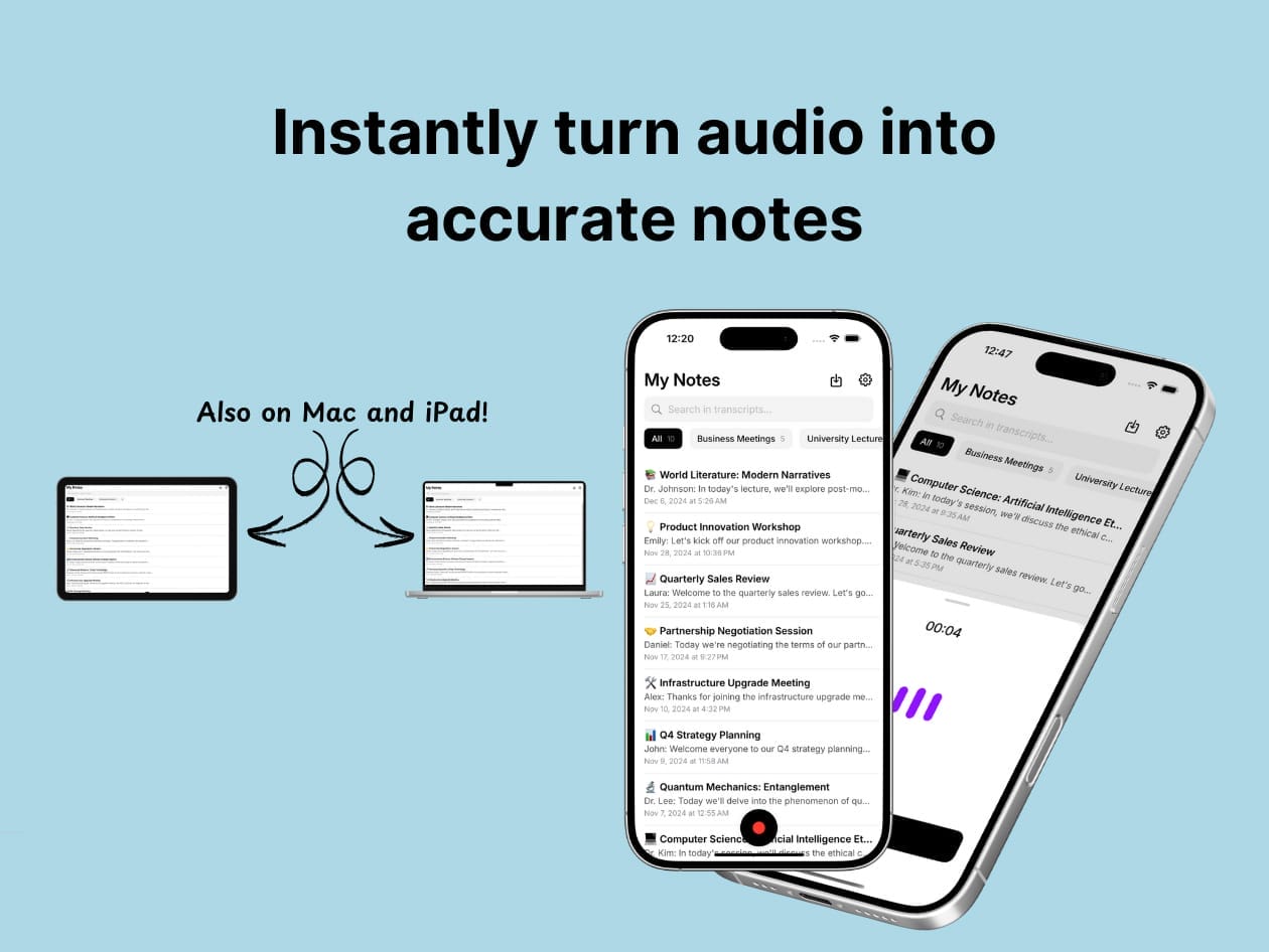 Experience unparalleled flexibility with live recording and audio upload support, combined with an intuitive interface that works seamlessly across your iPhone, iPad, and Mac. My Notes AI is designed to keep you organized and productive, no matter where you are.