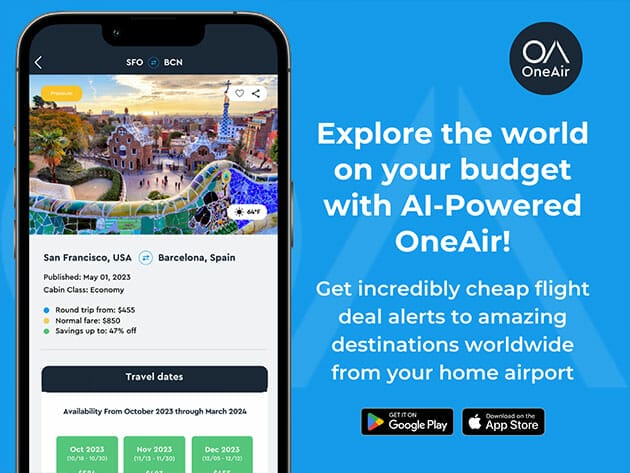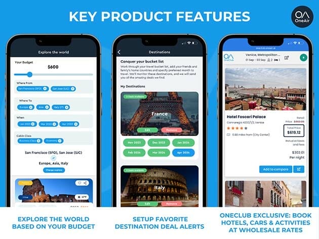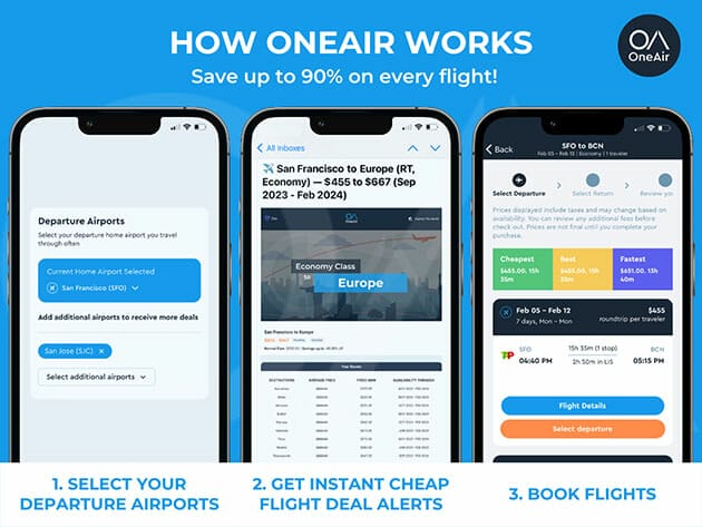 Having a lifetime subscription to OneAir Elite means you can book your dream vacation any time you want – forever. It’s easy to get started: 1) Select your departure airports 2) Get instant cheap flight deal alerts 3) Book flights. Watch your membership pay for itself with just one trip.