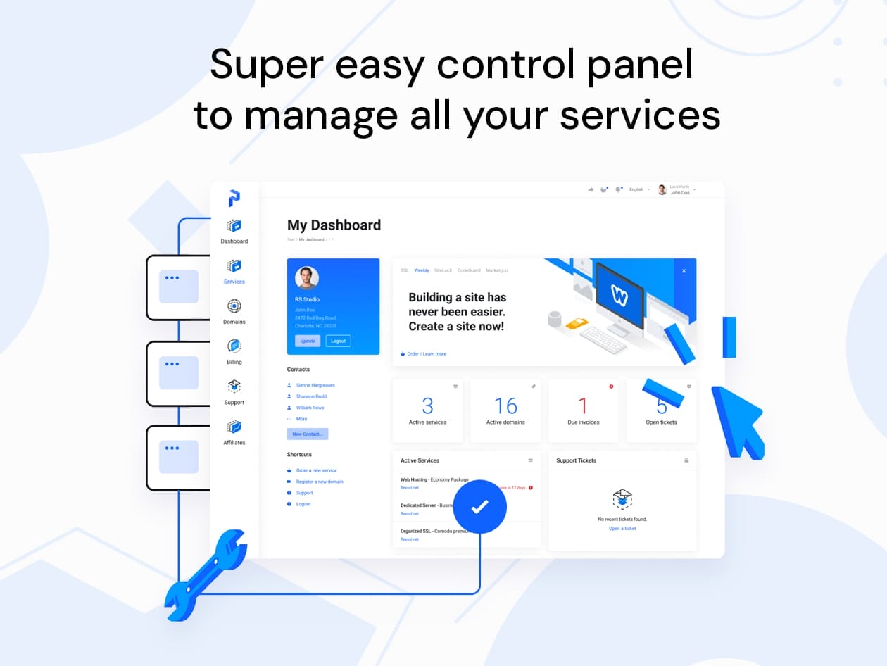 • Awesome Client Interfaces: Take control with an intuitive panel to manage websites, servers, mailboxes, and billing effortlessly.