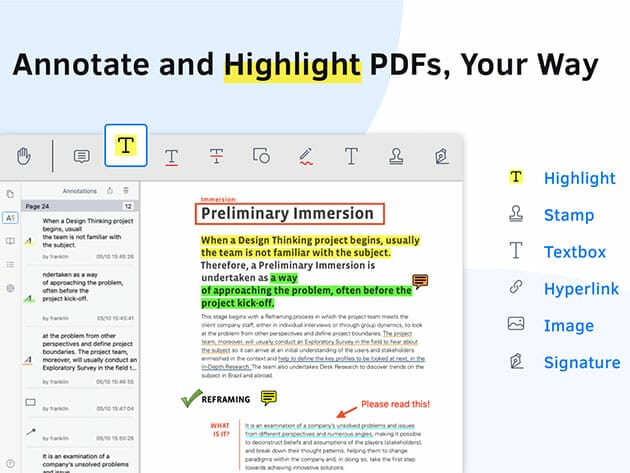Annotate PDFs with highlights, underlines, strikeout text, shapes, sticky notes, and text boxes